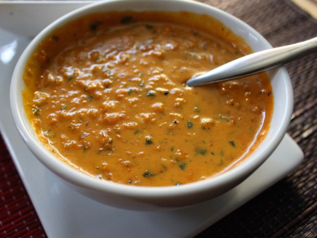 Heat annatto oil in a heavy skillet over medium.  Add the onions and garlic and sautée until the onions are softened, about 5 minutes.  Stir in the peanut-milk mixture and bring to a simmer, about 2-3 minutes. It should pour easily like cream, stir in milk as needed to get the right consistency.  Remove from heat and stir in cilantro.
