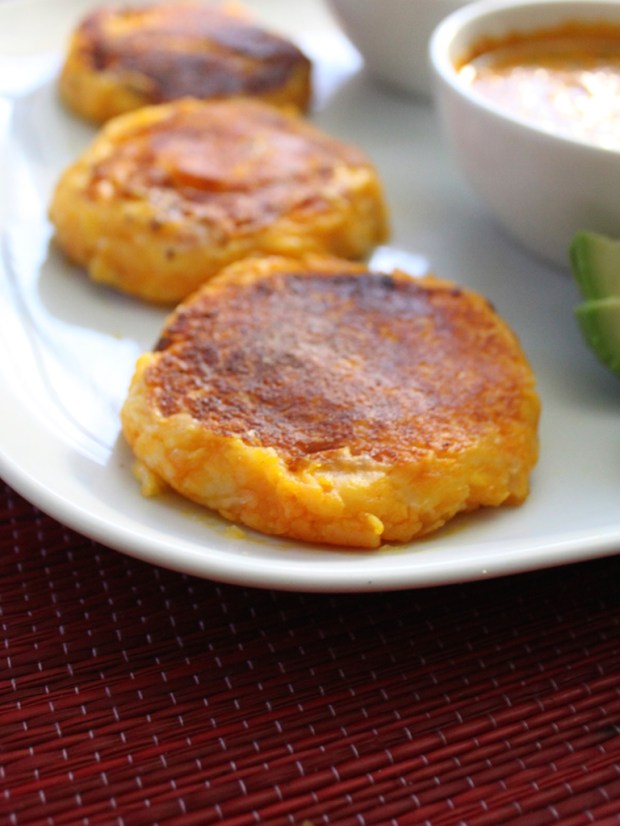 Heat skillet to medium high heat. Brush the skillet with annato oil and place on skillet until well browned. Brush the tops of the cake with annatto oil and carefully turn to brown the other side.
