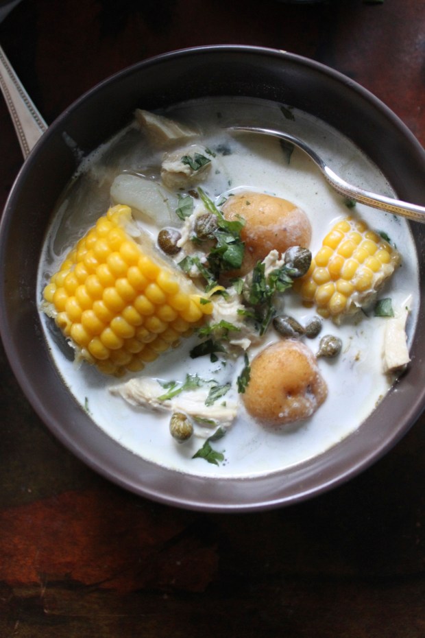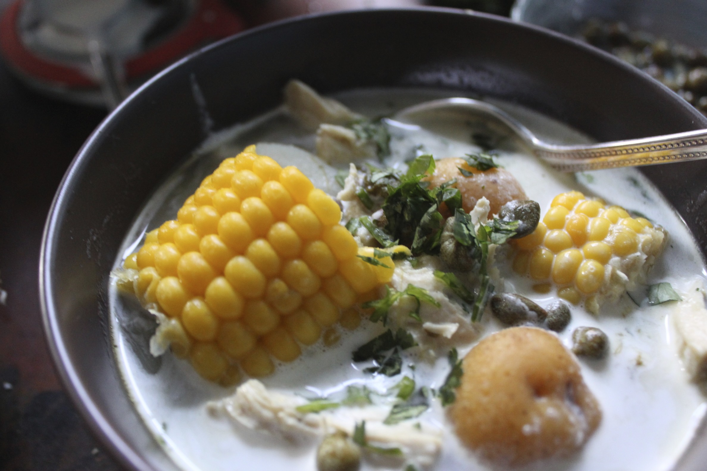 It seems that every time I look for a Colombian recipe, I fall into a soup bowl. With winter going fast and a long weekend to seek out hard to find ingredients, I was finally ready to attempt ajiaco Bogotano. Until recently, I’d only know the Cuban version – a heavy blend of root vegetables, plantains, pork and beef. In Bogota, ajiaco is a chicken only affair, thickened with three kinds of potatoes and flavored with cilantro, scallions and guascas, a pre-Columbian herb with medicinal properties and daisy relatives. When I tried it for the first time last year, I loved the ritual of adding your own dollop of thick cream, briny capotes, sliced avocado and even more cilantro from the garnishes brought to the table. Looking for a recipe, my friend Carolina’s mother, Mari Ines, tried to walk me through it on the phone but I wasn’t quite getting it. I knew I’d be home for a few days so I more or less invited myself over see it done first hand.