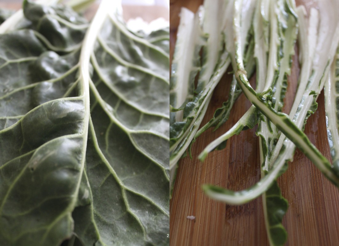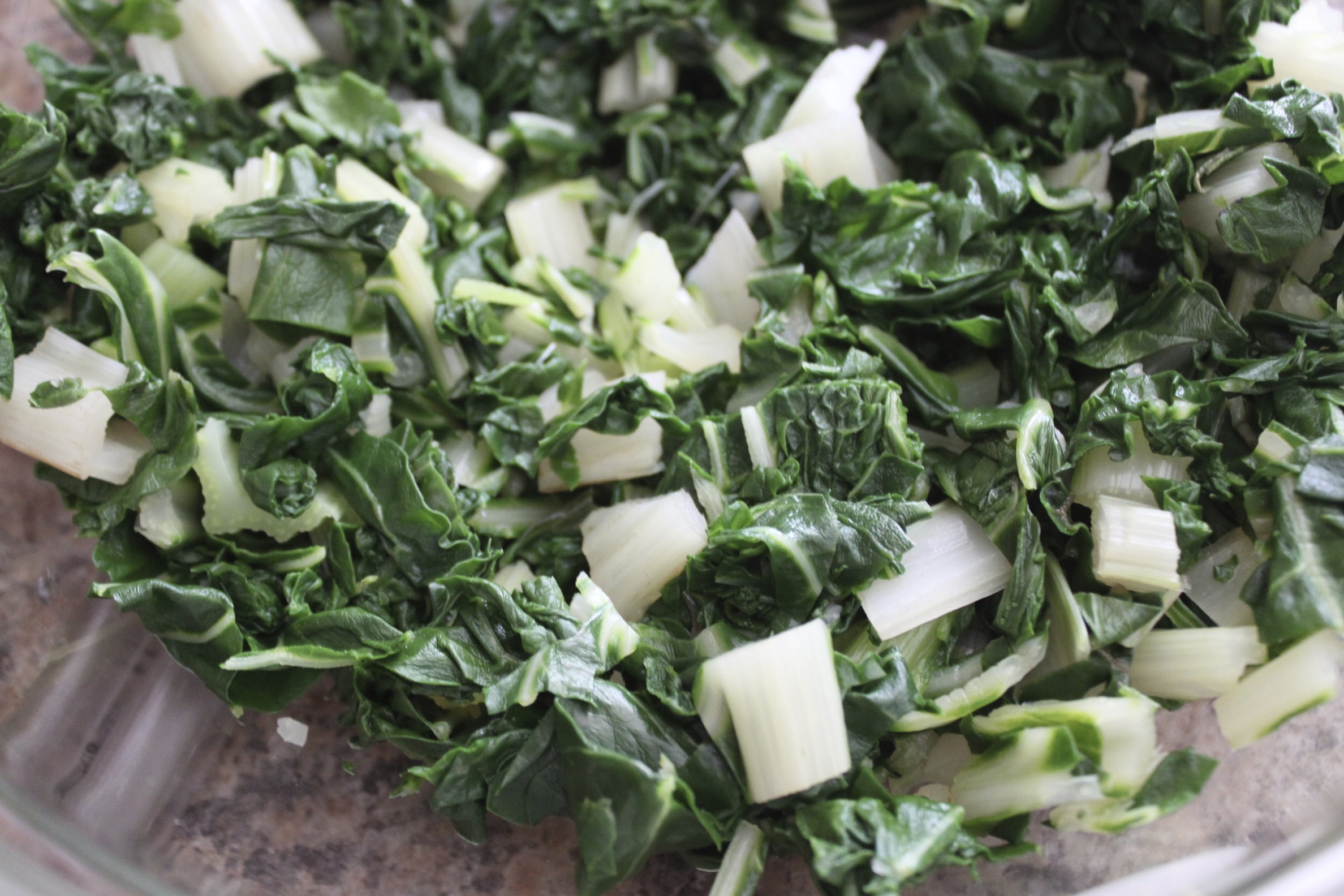 Trim the ends of the swiss chard and rinse thoroughly.  Separate the leaves from the stems reserving both.  Roughly chop the stems.  Prepare a large bowl of ice water and set aside.