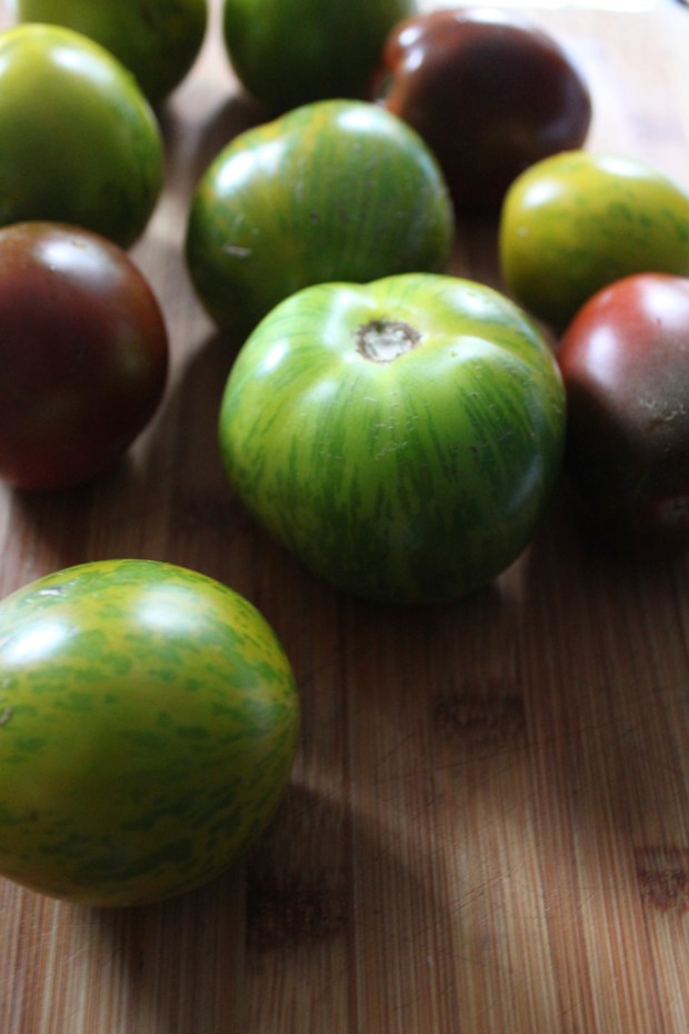 With the clock ticking on heirloom tomatoes, I went looking for green zebras in a kind of panic (false alarm – there are plenty left).  For the garnish (and more color), I found earthy, black prince tomatoes leaning towards purple.  The rest of the ingredients – cucumbers, cherry tomatoes, pearl onions, garlic and chives – were also at hand, so it was final chance take full advantage of the farmer’s market.
