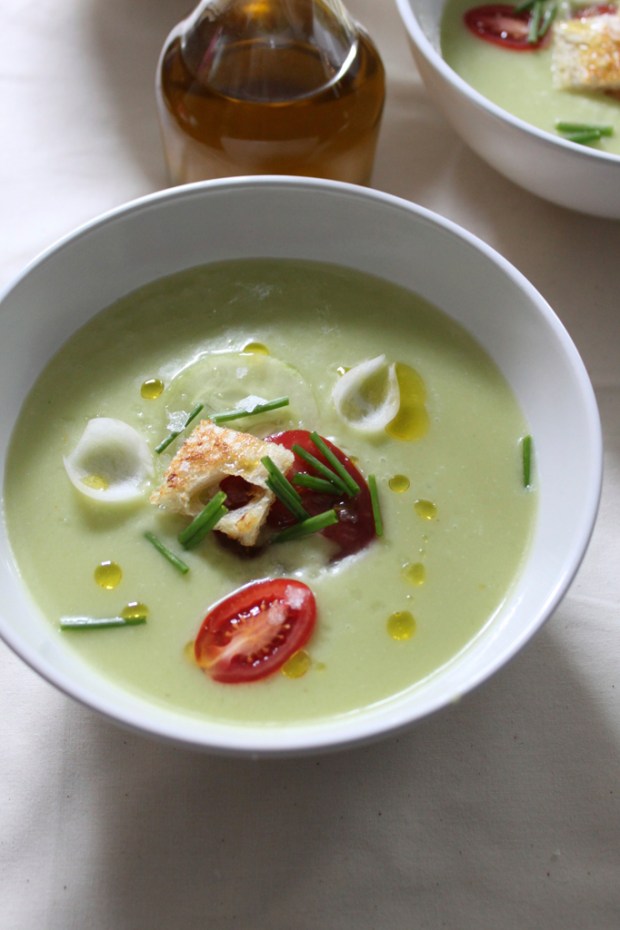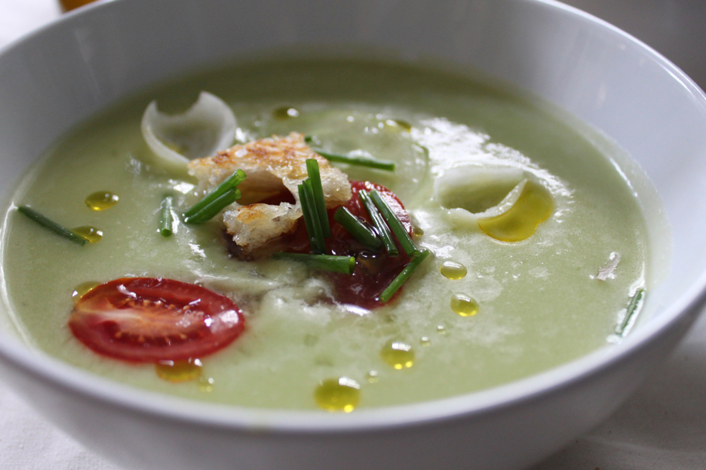 Lately, in my heat-addled mind, the most satisfying meals can be summed up in two words – cold and simple.  Though gazpacho meets both criteria, I’d yet to make it this summer.  Looking for a new variation, I tried this popular recipe for gazpacho al estilo de Patricia by Spanish chef José Andrés.  Having experimented with pale ajo blanco, deep pink gazpacho with strawberry and fennel, and classic red with tropezones, it was time to go green.
