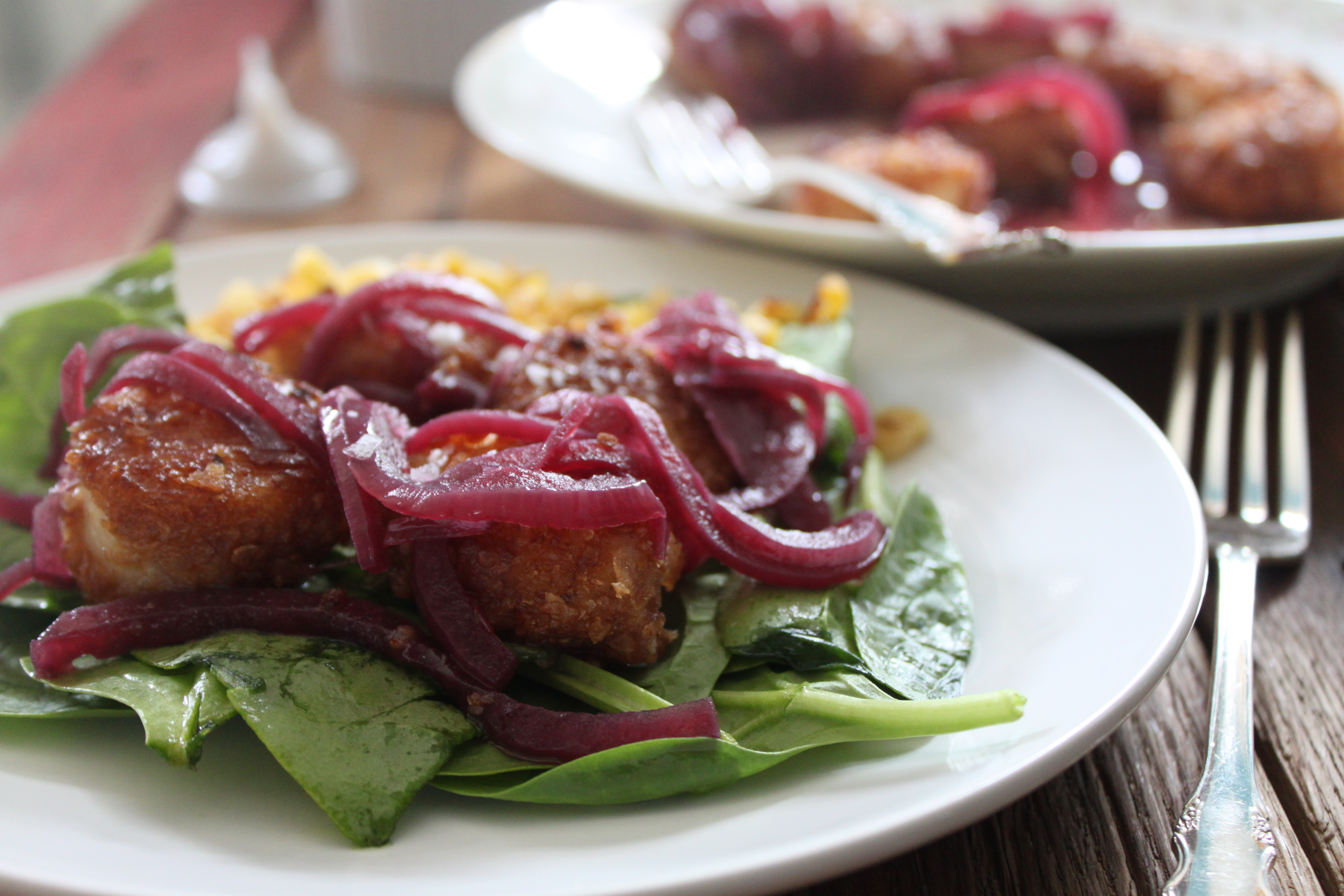 Place the scallops on large serving dish or individual plates.  Using a slotted spoon or tongs, top the scallops with the onions and lightly drizzle with wine sauce.  Serve over spinach greens with sweet corn on the side.