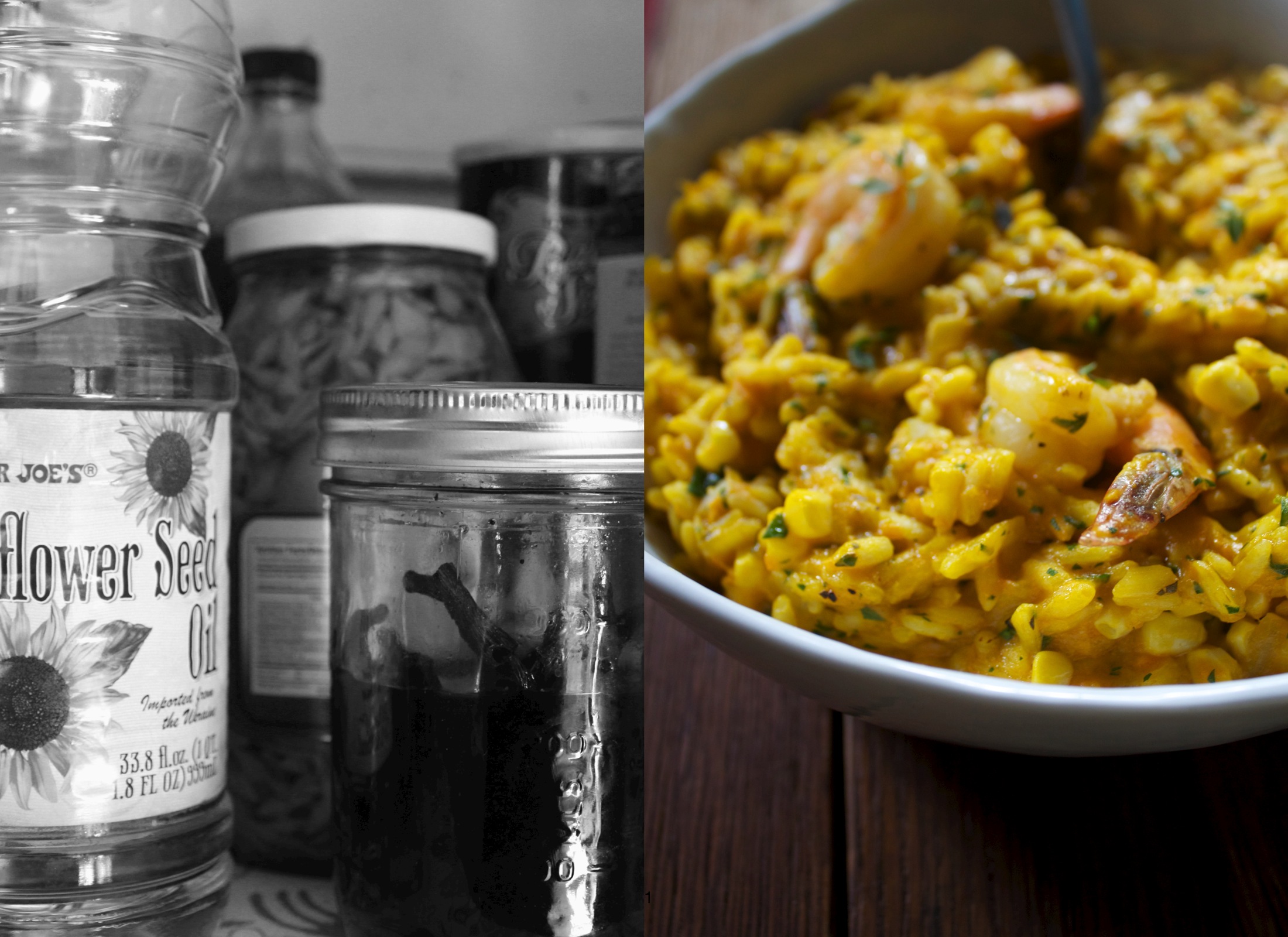 Before I put everything back, I made a quick list of at-risk items that were likely candidates for the next go around if I didn’t do something with them soon. At the top was the jar of preserved ají amarillo from Peru. A few months ago, it was the closest thing I could find to the peppers I needed for salsa a la huancaína but had moved on to fresh (or freshly frozen) since then. Consulting Yanuq, one of my favorite sites for Peruvian food, I found this recipe for risotto al perfume de ají made with a strong dose of ground peppers. The combination of creamy al dente rice and lip-stinging heat reminded me of my favorite seafood risotto, so I decided to sautée a few shrimp as well.
