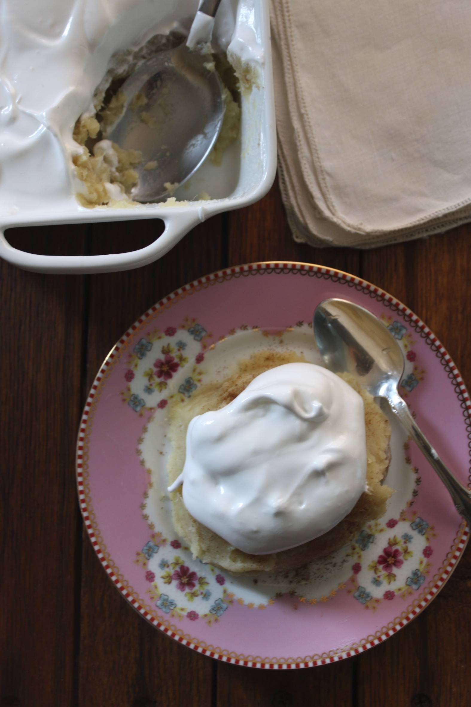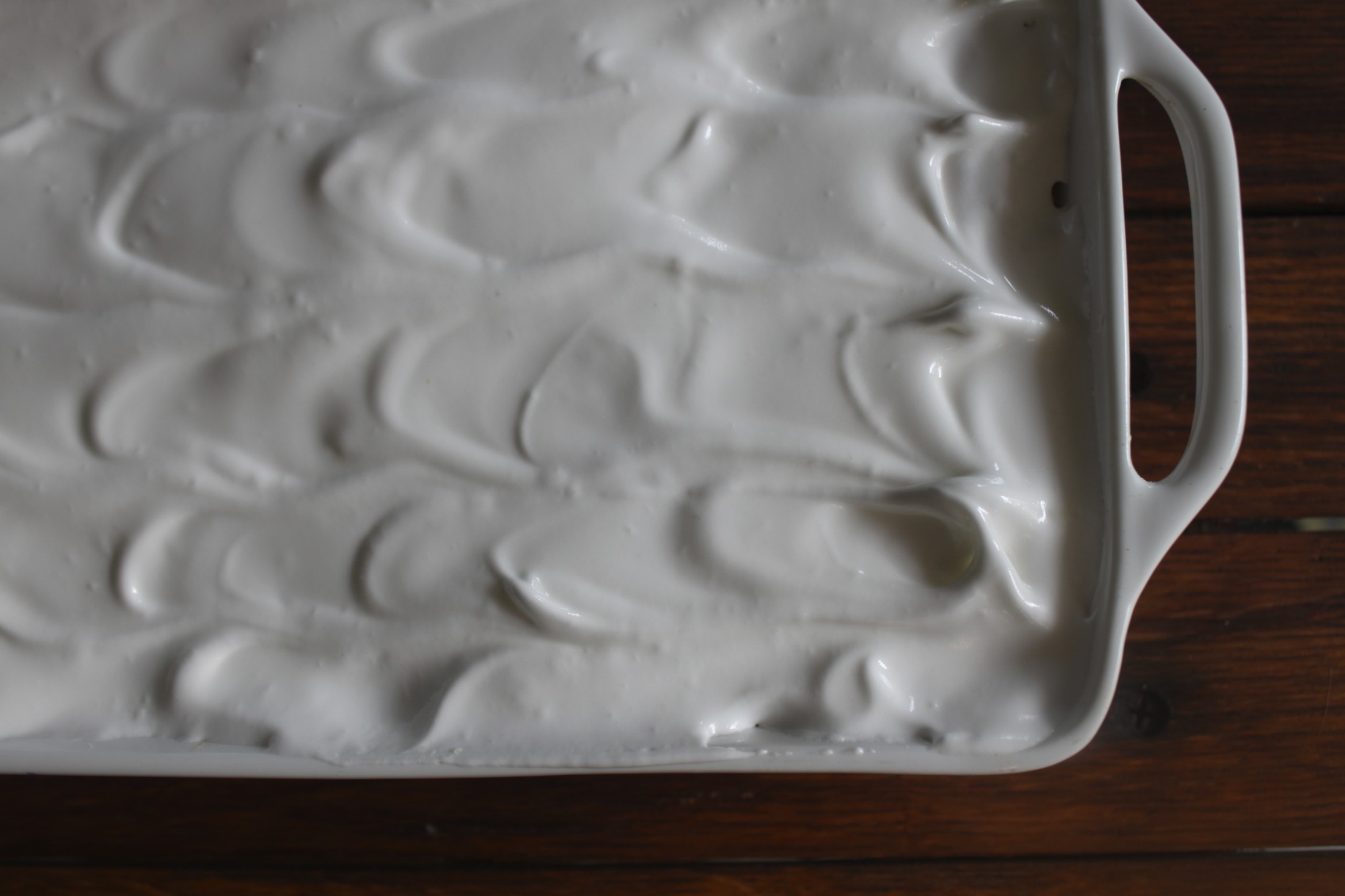 IMG_3204While the boniatillo chilled, I decided to make a quick meringue to top it off.  Having drastically cut down on the sugar called for in the original (and most other traditional) recipes, it could bear to be a little sweeter.  My great aunt Ninita served it this way and it was worth stopping the clocks to the get it right.