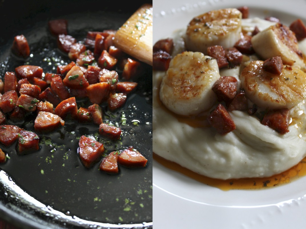 Griddle Scallops with Malanga Pureée and Chorizo Oil