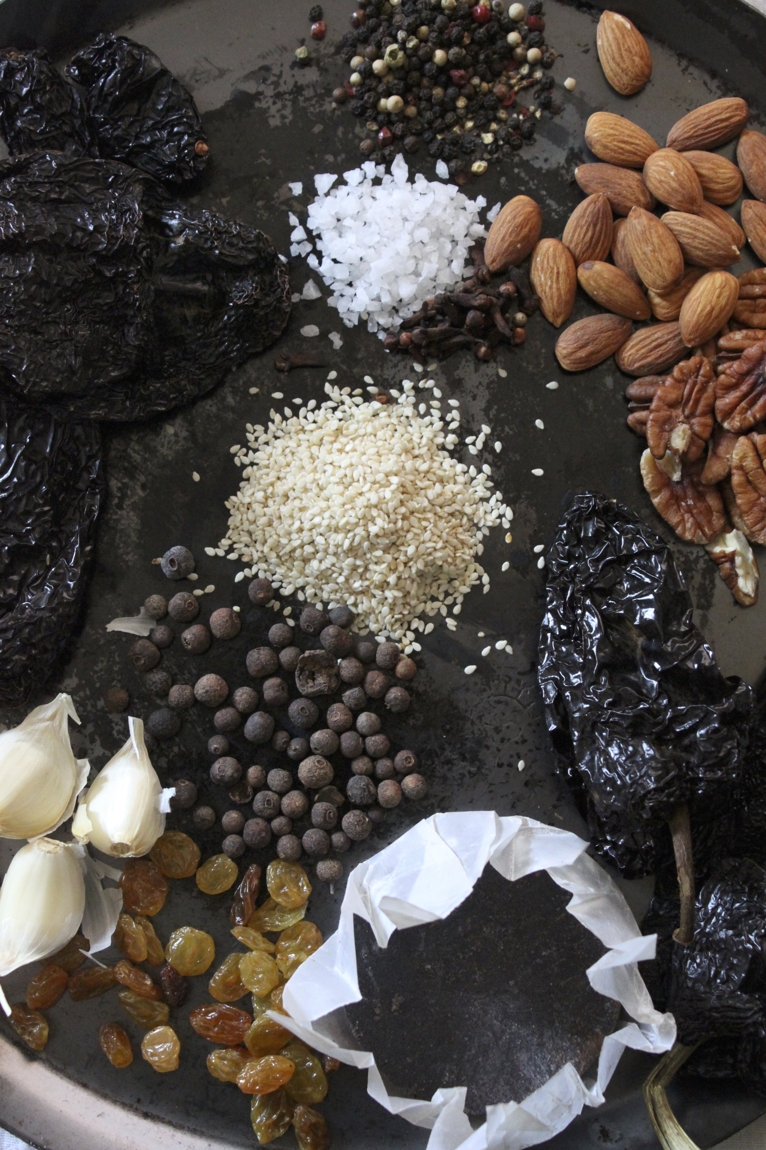 Adapted from the Mast Brothers Chocolate: A Family Cookbook by Rick Mast and Michael Mast. I’ve skirted around trying a full-on mole recipe for years. There was something open ended about this version which falls somewhere between a mole Poblano and dark mole Oaxaca. Full disclosure, I did not use Mast Brothers chocolate which is a little too dear (as in pricey) to have any other way than on its own. Also, I had actual artisinal chocolate from Oaxaca which almost never happens. Unlike more traditional recipes, it doesn’t call for setting the seeds on fire or burning the tortilla to a crisp but I did roast the chiles and vegetables. Instead of bananas, I went with ripe, nearly black plantains. Next time, I’ll definitely be more prepared to play with fire.