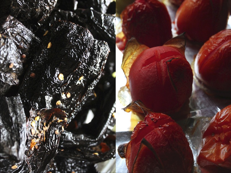 In the meantime, place the tomatoes, tomatillos, onion, and garlic on a foiled baking sheet. Check regularly and turn until charred and cooked through, 20 to 30 minutes. This can also be done in a broiler but should be watched closely. Set aside until ready to use.