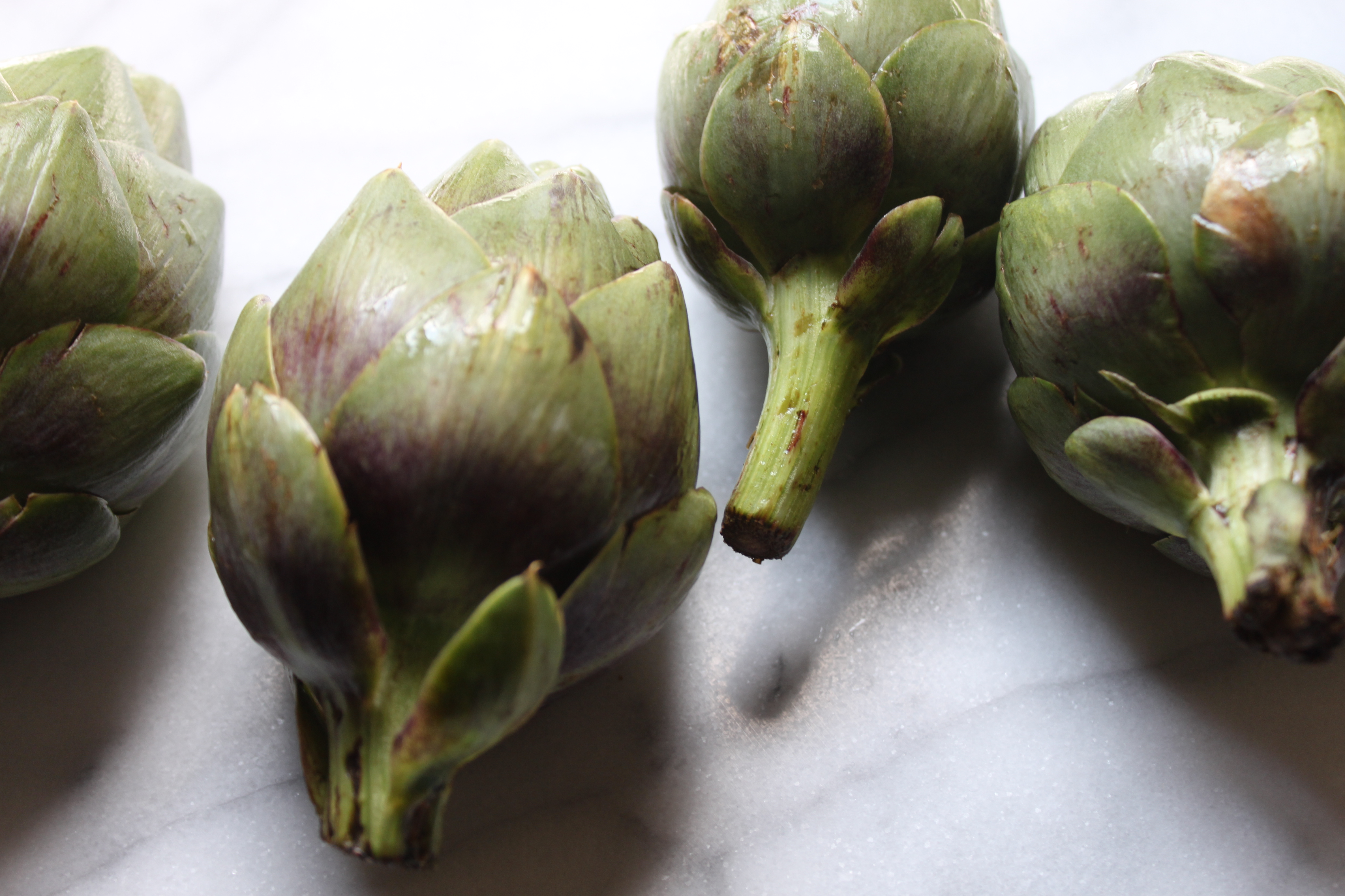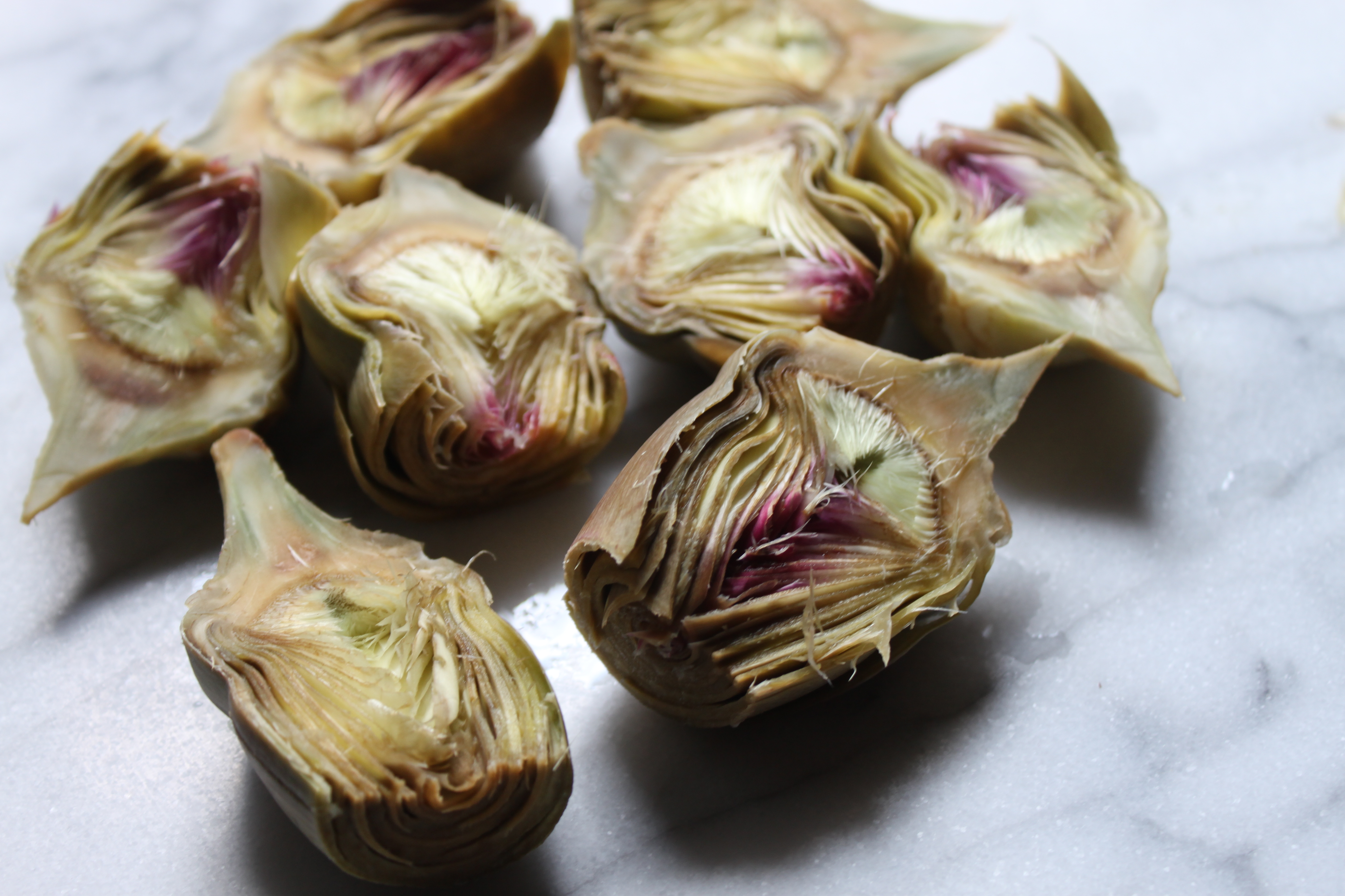 1 pound baby artichokes with stems, trimmed and halved lengthwise, tough outer leaves discarded