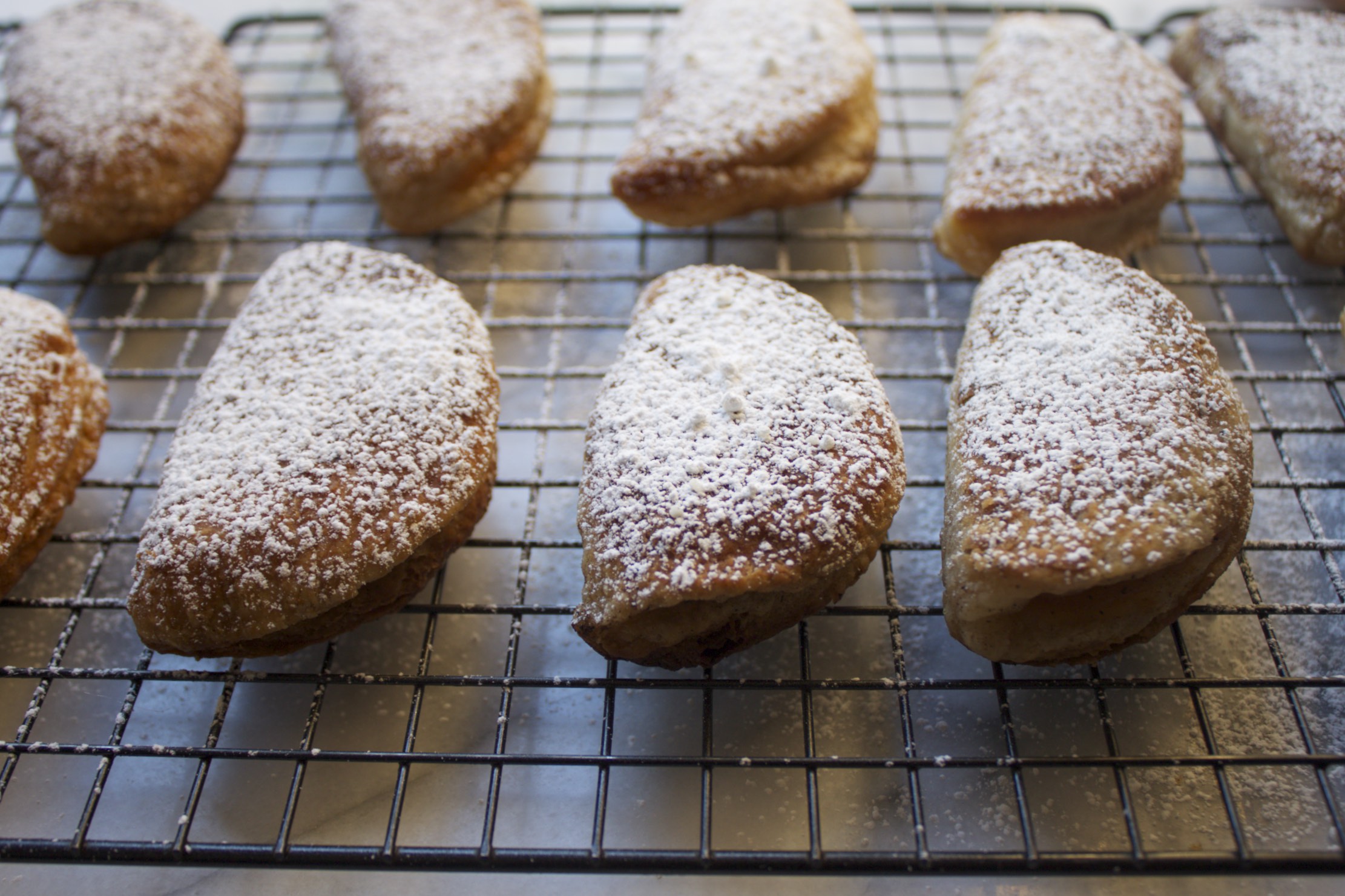 To cook: Add equal amounts of butter and lard (or clarified butter) to a depth of about 1/4-inch in a skillet and heat. When fat is sizzling, slide pies into skillet, being careful not to overcrowd. Fry on one side until browned, turn with a spatula, and brown the other side. Transfer to a tray lined with paper towels to drain. Repeat, adding more butter and lard as needed, until all the pies are cooked. Arrange pies on a platter and sprinkle with powdered sugar. Makes 12 pies.