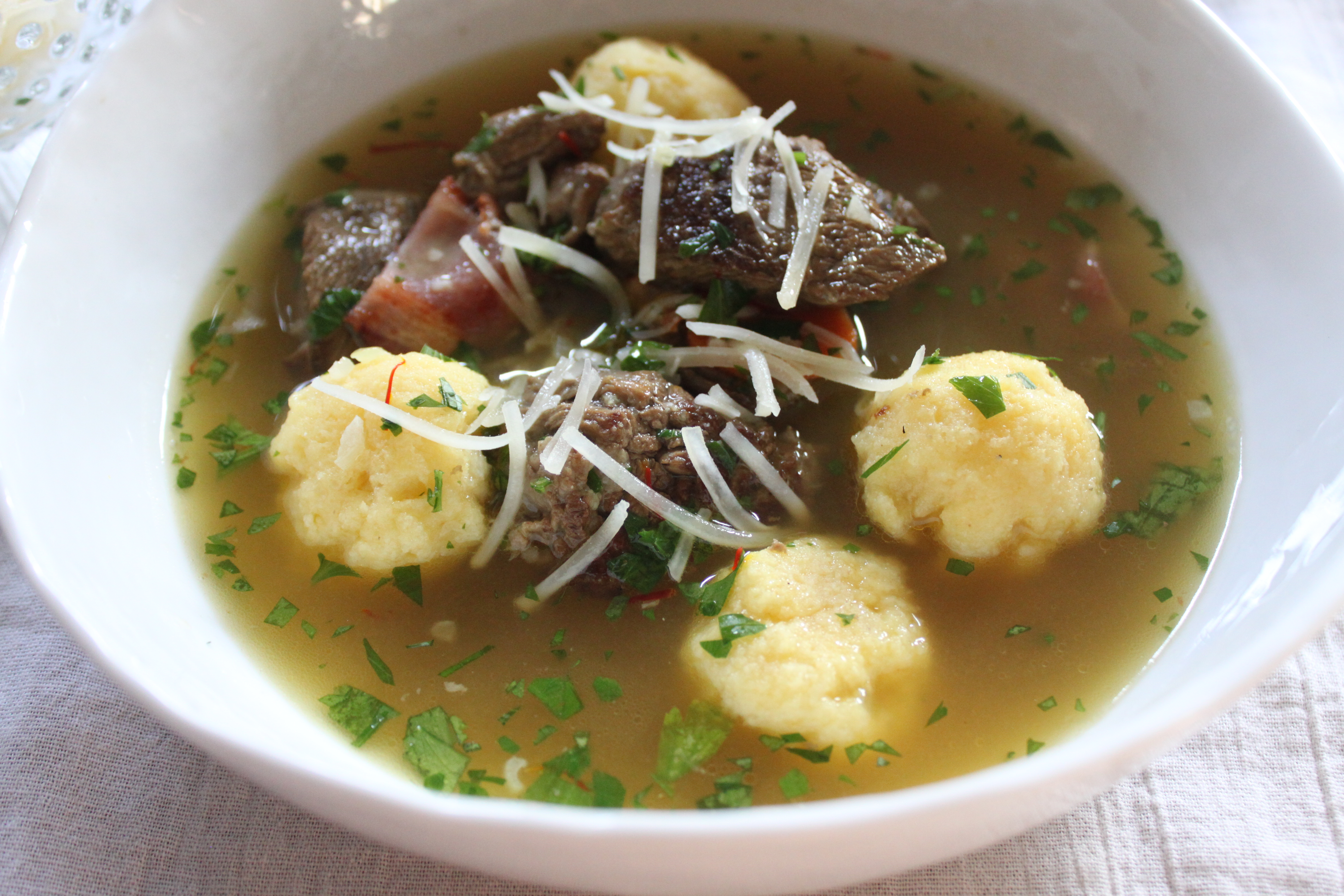 In a large pot or sauté pan, bring the reserved 10 cups of broth to a boil, adding saffron, if using. Lower the heat and add the meat; cook for 15 minutes and correct the seasoning with salt to taste. Gently places the dumplings into the broth and continue simmering 15 minutes more. Serve the soup at once sprinkled with chopped parsley.  Pass the parmesan at the table.