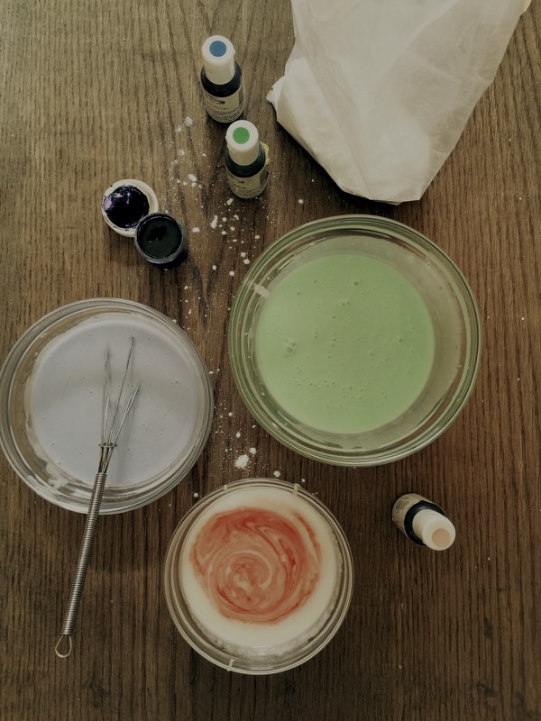 Prepare sugar icing of confectioner’s sugar, a dash of vanilla and enough milk to achieve the desired consistency. Separate into 3 small bowls and add food coloring to each – one pink, on lavender, one pale green.